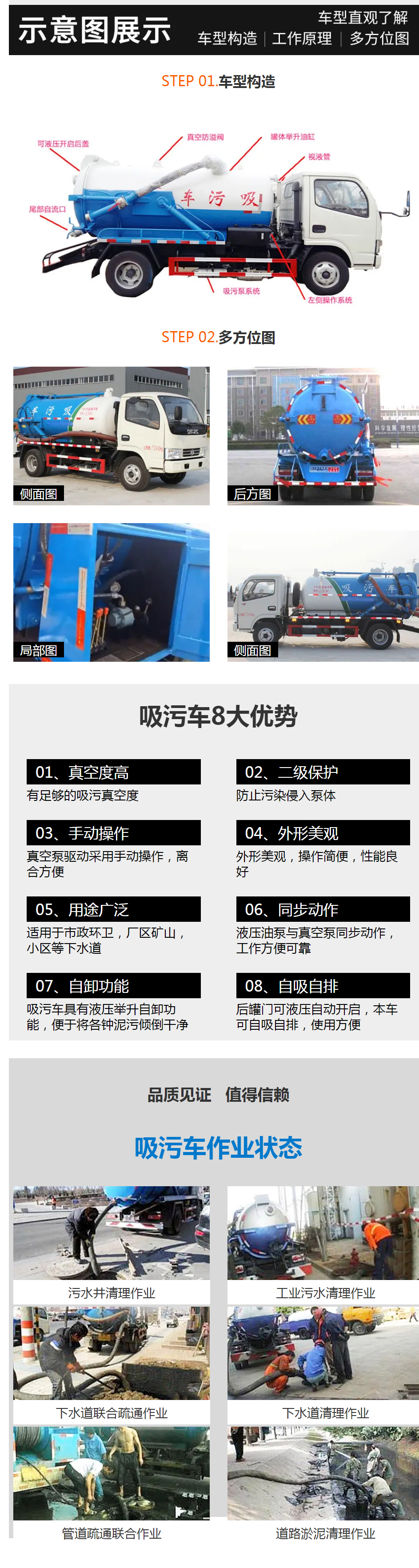 【性能簡介】真空吸污車主要適用于小區物業、市政環衛、企事業單位、養殖場使用。下水道、雨水井、涵管、化糞池、沼氣池及各種溝渠內的廢水、污泥、泥漿、糞便抽吸、裝運和排卸。罐體設有液位計、高液位保護報警裝置、高液位保護防溢流裝置,防止吸滿倒灌真空泵系統。罐體為圓柱形,可液壓舉升自卸,后蓋可液壓打開,提升運送和清洗效率。真空泵可自吸自排,排污采用自排和壓力排放。
