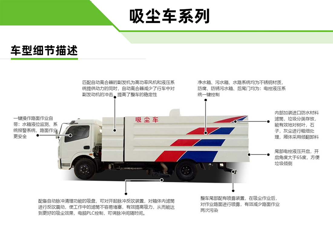 五十鈴10方吸塵車上裝配置:水箱3方,塵箱7立方,吸塵寬度3米,吸塵速度3-15公里每小時,吸入顆粒110mm,駕駛室內全電腦觸屏控制,灰塵過濾器,進口脈沖除塵,車尾噴霧降塵裝置。 適合場合:適合于中小型廠區(qū)路面除塵作業(yè),無揚塵,可達到環(huán)保要求。