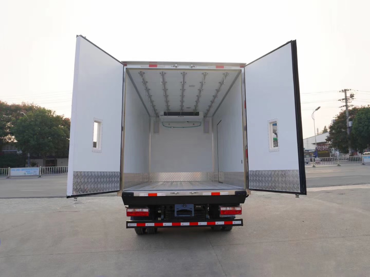 廂體工藝: 廂體材質采用內外玻璃鋼,中間8CM聚氨酯保溫板,后雙開門,廂體右側靠前選裝開側門,底部采用花紋防滑鋁板,前部排水孔,門邊條采用迷宮式橡膠密封條,鋁合金型材包邊,不銹鋼包角,不銹鋼門鎖,不銹鋼門框及合頁,廂體內節能LED照明燈。